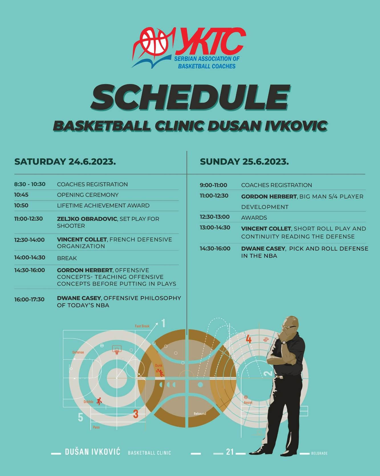 Кошаркашка клиника Душан Ивковић биће одржана последњег викенда јуна, 24. и 25. јуна 2023. у „Дворани Александар Николић“, у Београду. Стручни семинар ће предводити наш најтрофејнији тренер Жељко Обрадовић коме ће се придружити стране колеге селектори Винсен Коле, Гордон Херберт као и НБА легенда Двејн Кејси.